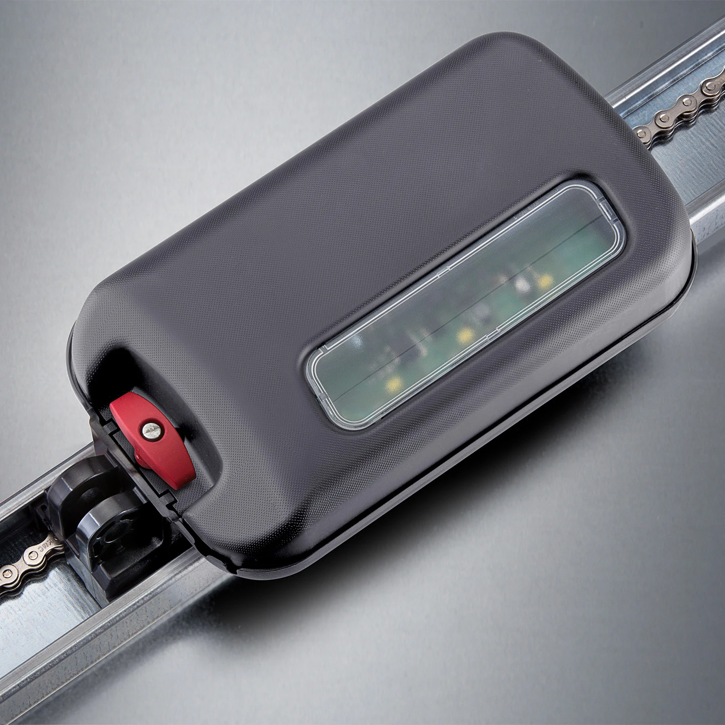 In dem unter der Marke Aperto angebotenen Garagentorantrieb A550 L steckt eine langjährig entwickelte und bewährte Antriebstechnik. So funktioniert auch dieser nach dem Prinzip eines Deckenschlepper-Antriebs. Dies bedeutet, dass die eigentliche Antriebseinheit, der Laufwagen, selbst mit dem Tor mitfährt. Die Antriebskette, welche bei vielen anderen Herstellern das Tor zieht, ist beim Deckenschlepper dagegen feststehend aufgespannt. Der Vorteil dieser Kombination aus beweglicher Antriebseinheit und feststehender Kette besteht darin, dass dieses Prinzip wartungsfrei, leise und verschleißarm ist. So ist es z. B. nicht notwendig die Kette oder die Laufschiene in regelmäßigen Abständen zu ölen. Auf der anderen Seite halten die Antriebe in der Regel auch länger als vergleichbare herkömmliche Garagentorantriebe mit bewegliche Kette.