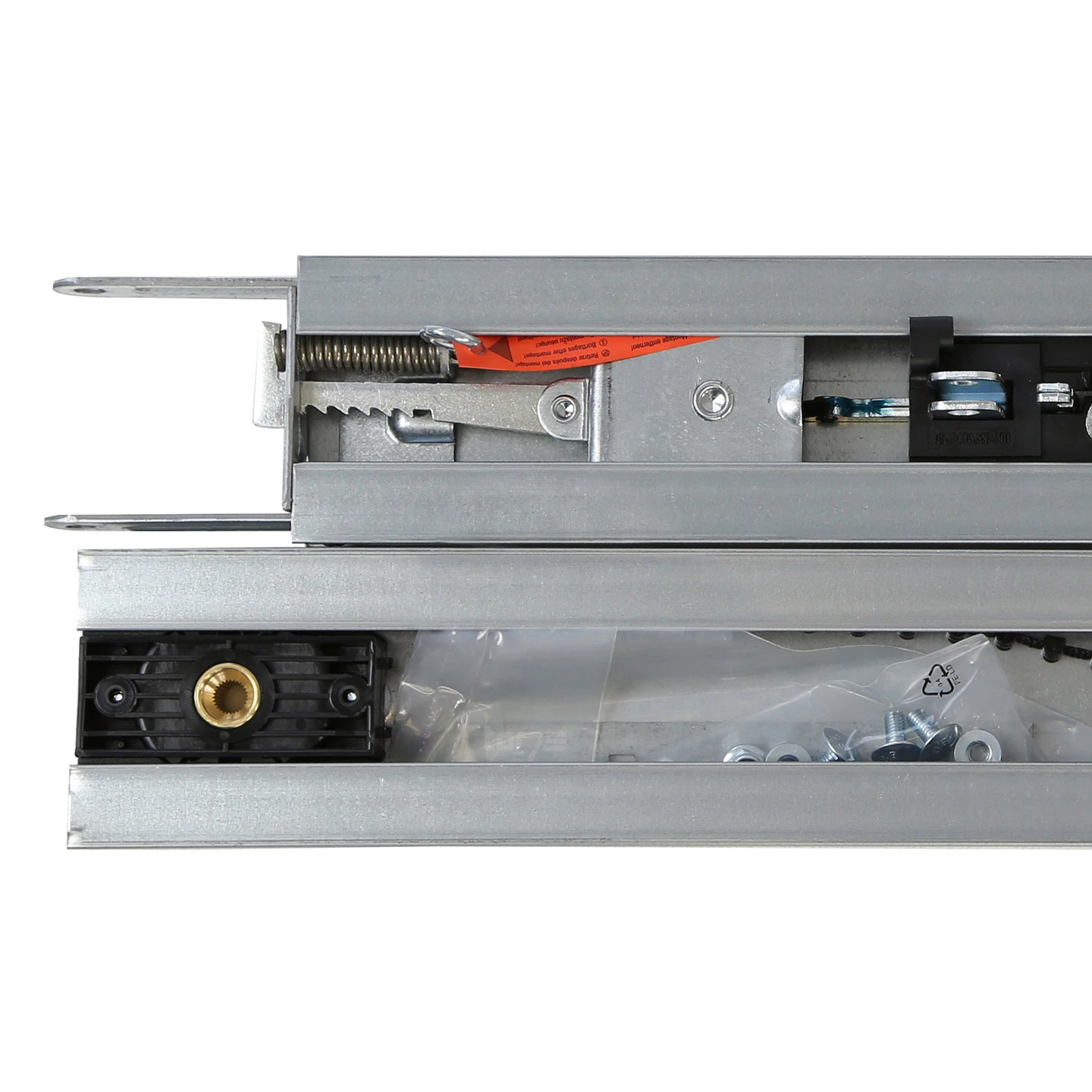 Darüber hinaus sind die stabile Zahngurtkupplung, die automatische Spannvorrichtung und auch der Führungsschlitten für höchste Ansprüche, eine lange Lebensdauer und Funktionsfähigkeit ausgelegt. Die eigentliche Antriebsschiene besteht aus verzinktem, hochwertigem Stahl, wird mittig geteilt und durch ein Klappscharnier zusammengehalten.