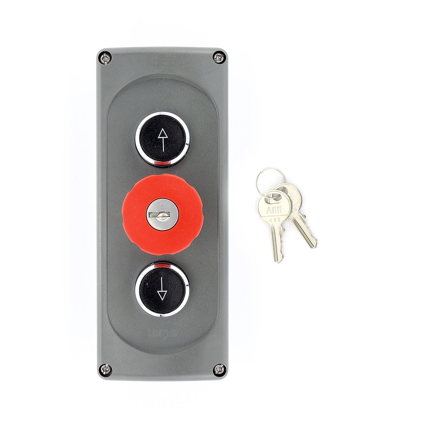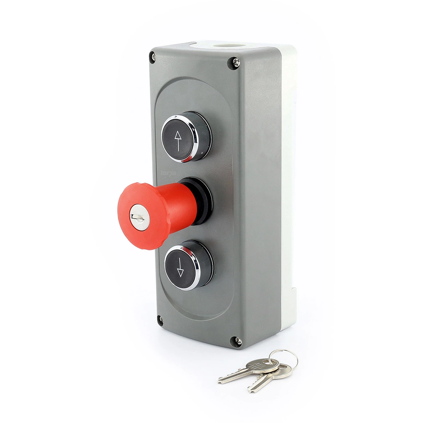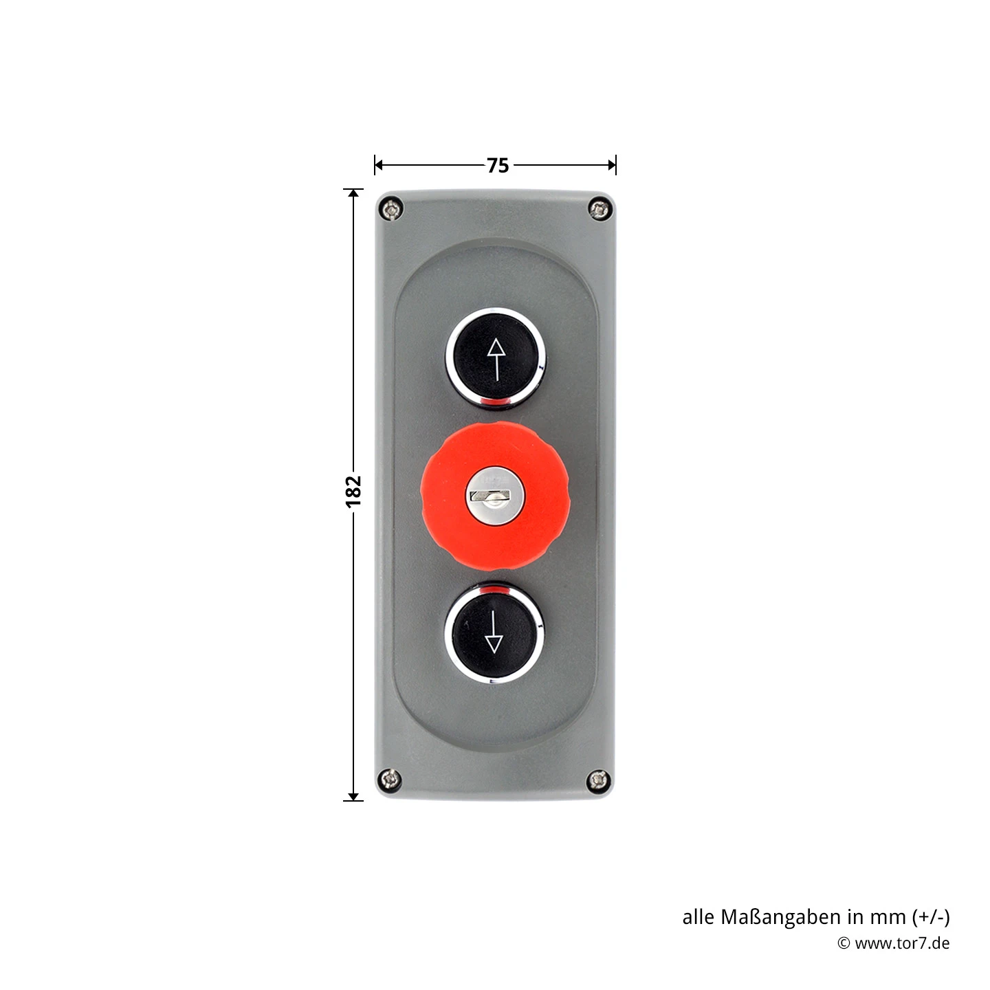 Der Hörmann Drucktaster DTNA 30 dient als zusätzliches Bedienelement für den Hörmann Schiebetorantrieb STA 400 und somit für industrielle Zufahrten. Ausgerüstet mit der Schutzklasse IP 65 ist der Taster staubdicht, bietet Schutz vor starkem Strahlwasser und kann somit problemlos im Außenbereich montiert werden. Die Bedienung erfolgt über die Tasten Auf und Zu. Die zusätzliche Bedientaste Halt ist rastend, d. h. bei Betätigung rastet der Taster ein und wird erst durch Ziehen wieder entsperrt. Erst dann kann der Taster wieder verwendet werden. Zum Schutz vor unbefugtem Zugriff ist der Drucktaster mit einem Miniaturschloss am Halttaster ausgestattet und wird mit 2 Schlüsseln geliefert. Alle verwendeten Materialien und Komponenten sind aus hochwertigen und langlebigen Materialien gefertigt und sorgen so für einen praxistauglichen, dauerhaften Einsatz.