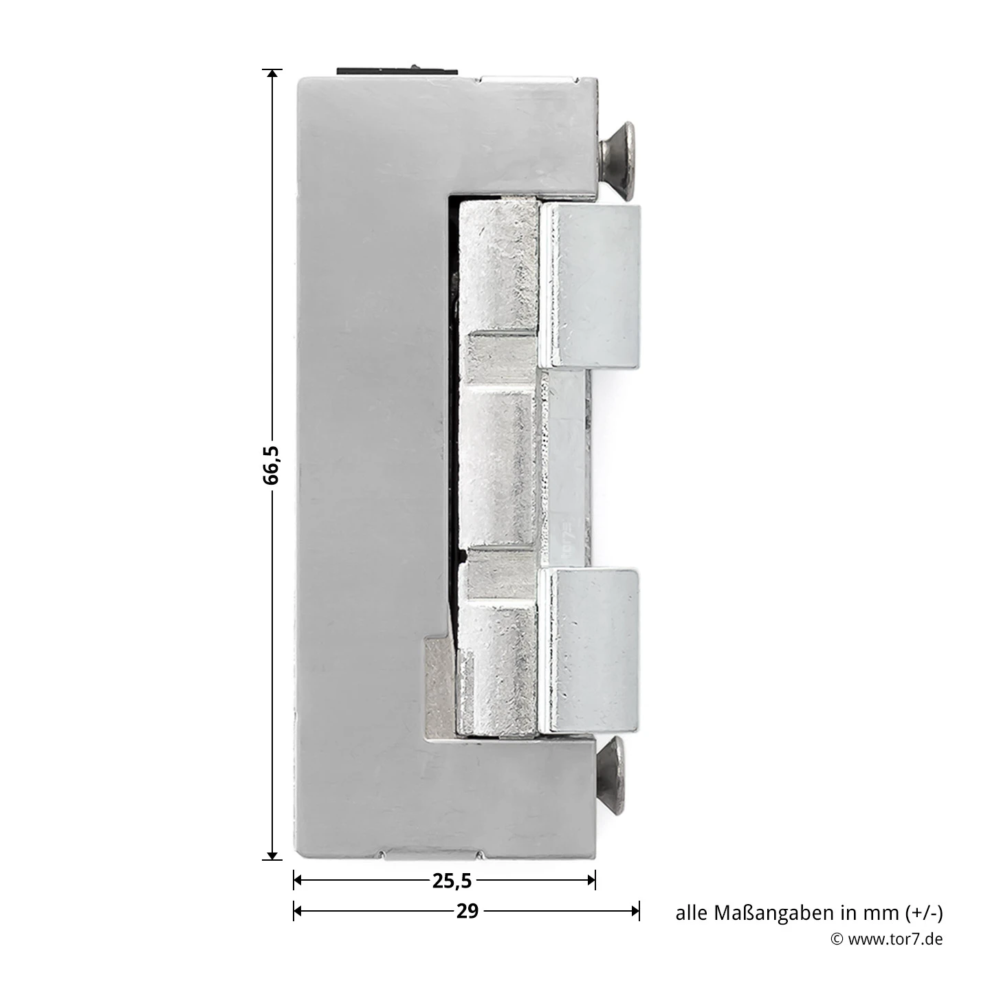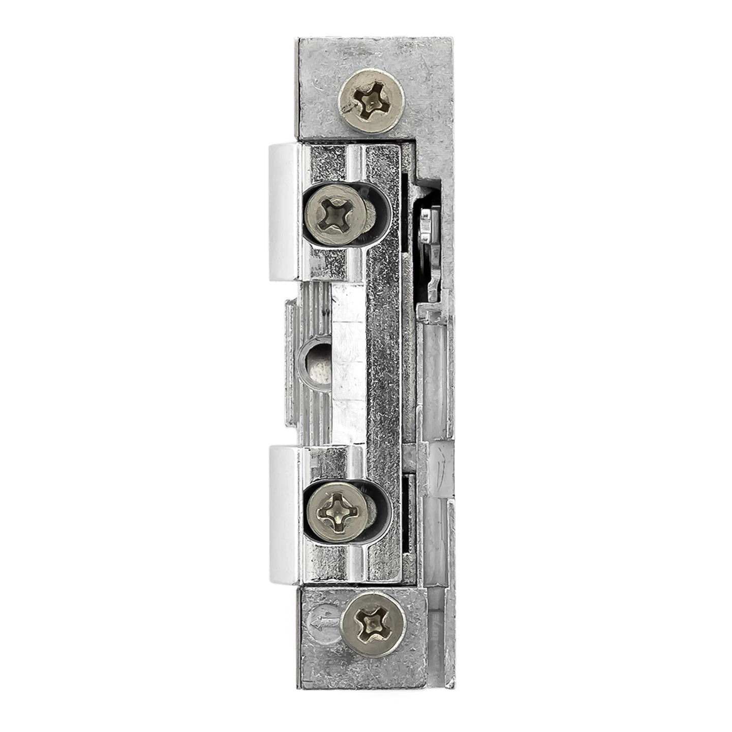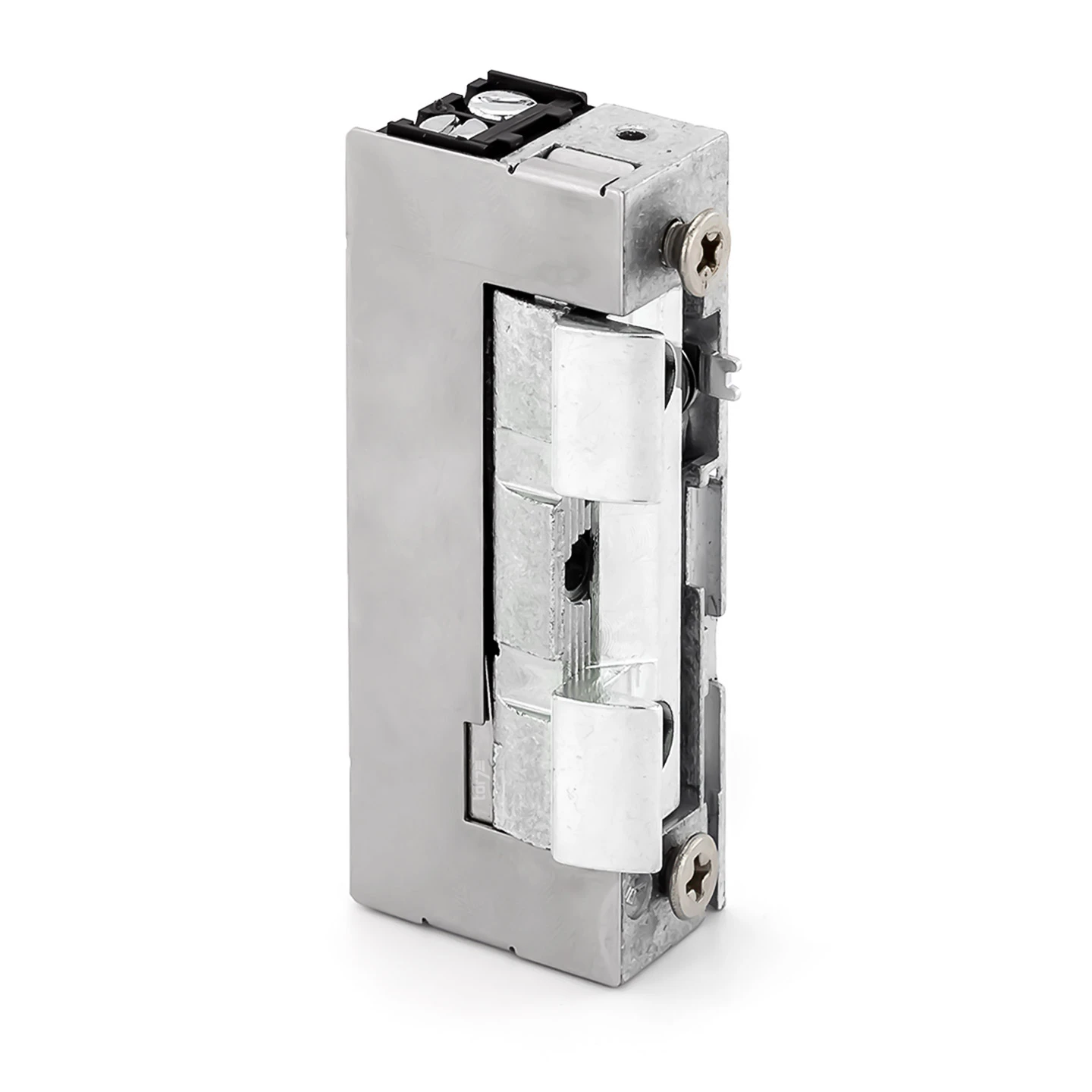 Bei der mechanischen Entriegelung eines elektrischen Türöffners kann die Schlossfalle über einen Sperrhebel freigegeben werden, sodass sich die Tür auf diese Weise öffnen lässt. Diese Entriegelung wird auch als Tagesfalle oder Tagesentriegelung bezeichnet. Der E-Öffner befindet sich im Rahmen der Haustür in einem speziellen Schließblech. Dort hält er die Schlossfalle fest oder gibt sie frei. Der elektrische Türöffner ist für linke und rechte Türen verwendbar und wird mit einer Spannung von 6, 12 oder 24 Volt gespeist.