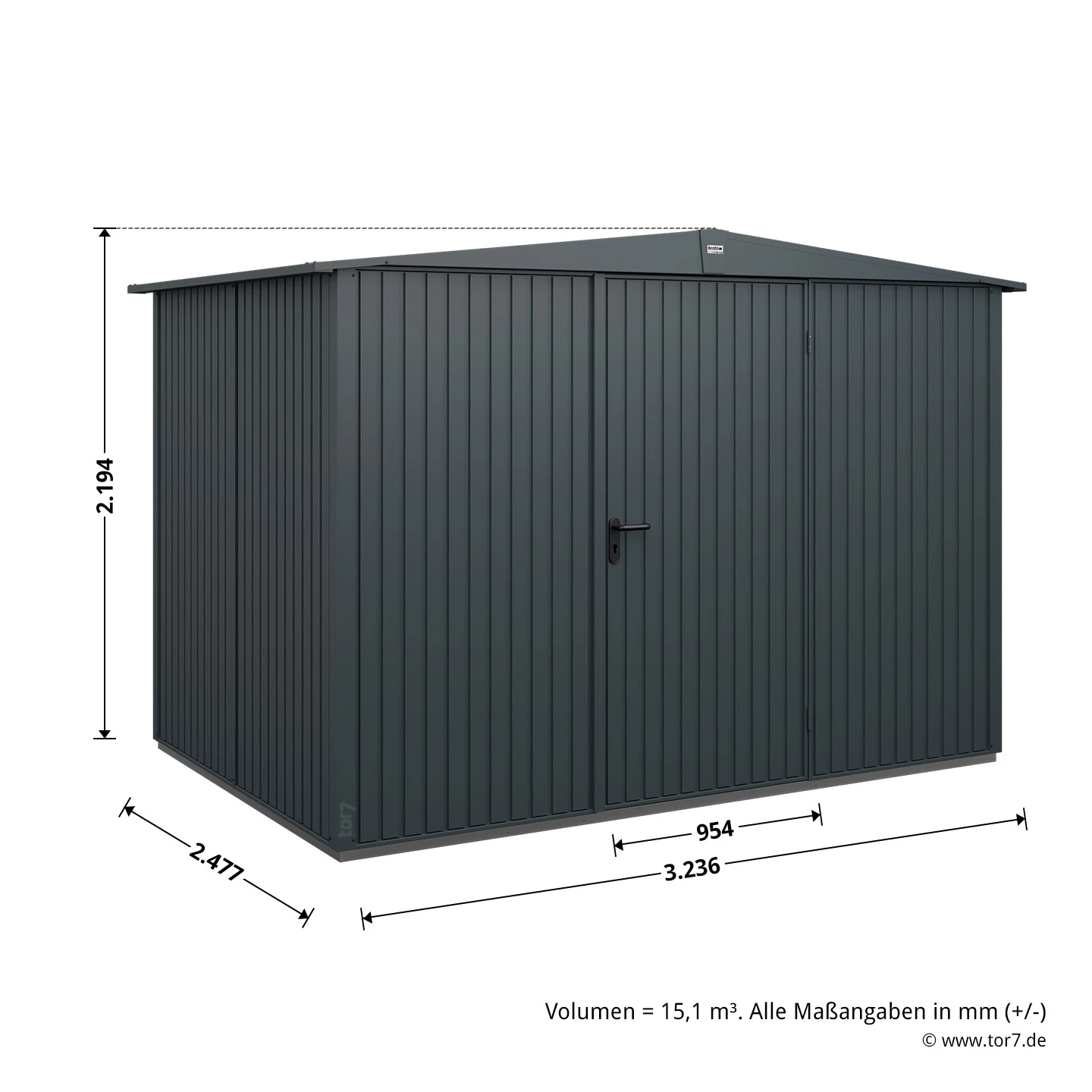 Das EcoStar Gerätehaus TREND-S Typ 3 bietet mit seinen Außenabmessungen (B x T x H) von 3236 x 2477 x 2194 mm den größtmöglichen Stauraum und die größte Nutzfläche. Das feuerverzinkte und pulverbeschichtete Stahlblech ist äußerst witterungs- und windlastbeständig. In Verbindung mit dem Aluminium-Bodenrahmen ist so eine optimale Stabilität der Konstruktion gewährleistet, auf die der Hersteller eine Garantie von 20 Jahren gewährt. 5 moderne Farbtöne, ein- oder zweiflügelige Türausführungen und ein umfangreiches Zubehörprogramm ermöglichen die individuelle Anpassung an die jeweilige Nutzung und den persönlichen Geschmack.