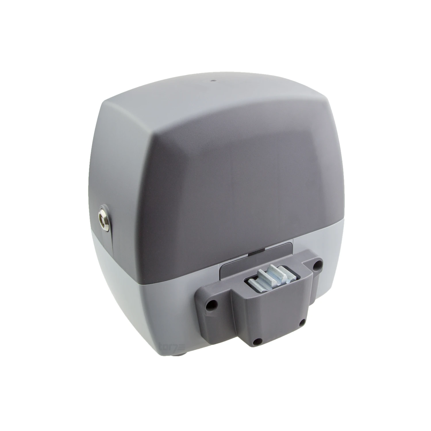 Der in einem definierten Betonsockel verankerte Antriebsmotor bewegt das gerade verzahnte Antriebszahnrad Modul 4, welches in die fest am Schiebetorflügel verschraubten Zahnstangen greift und so das Hoftor bewegt. Die Steuerungsplatine ist dabei ebenso im abschließbaren Antriebsgehäuse untergebracht wie der integrierte 868-MHz-BiSecur-Funkempfänger.
