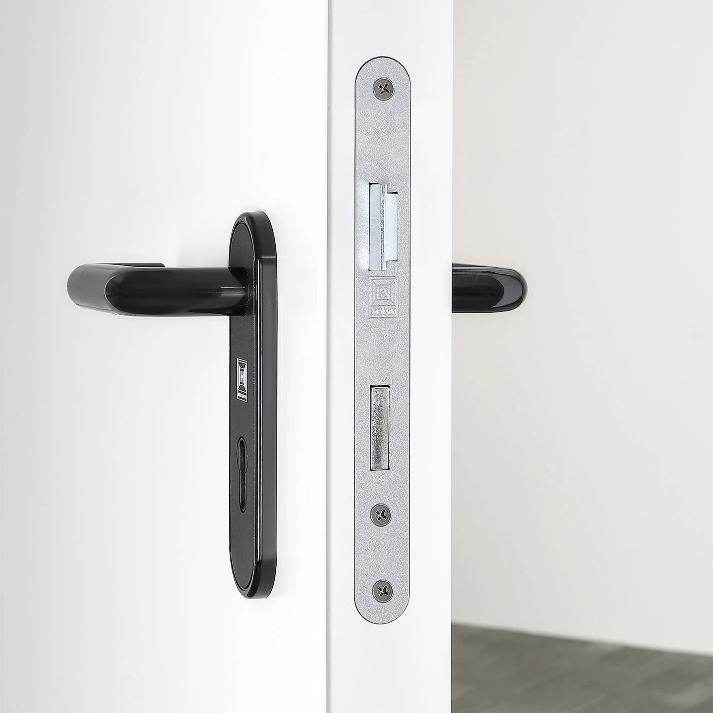 | Drückerausführung | Drückergarnitur Typ D-110, mit Kurzschild, Kunststoff schwarz, U-Form, mit Stahlkern, für Profilzylinder und Buntbartschlüssel, lose beigelegt |