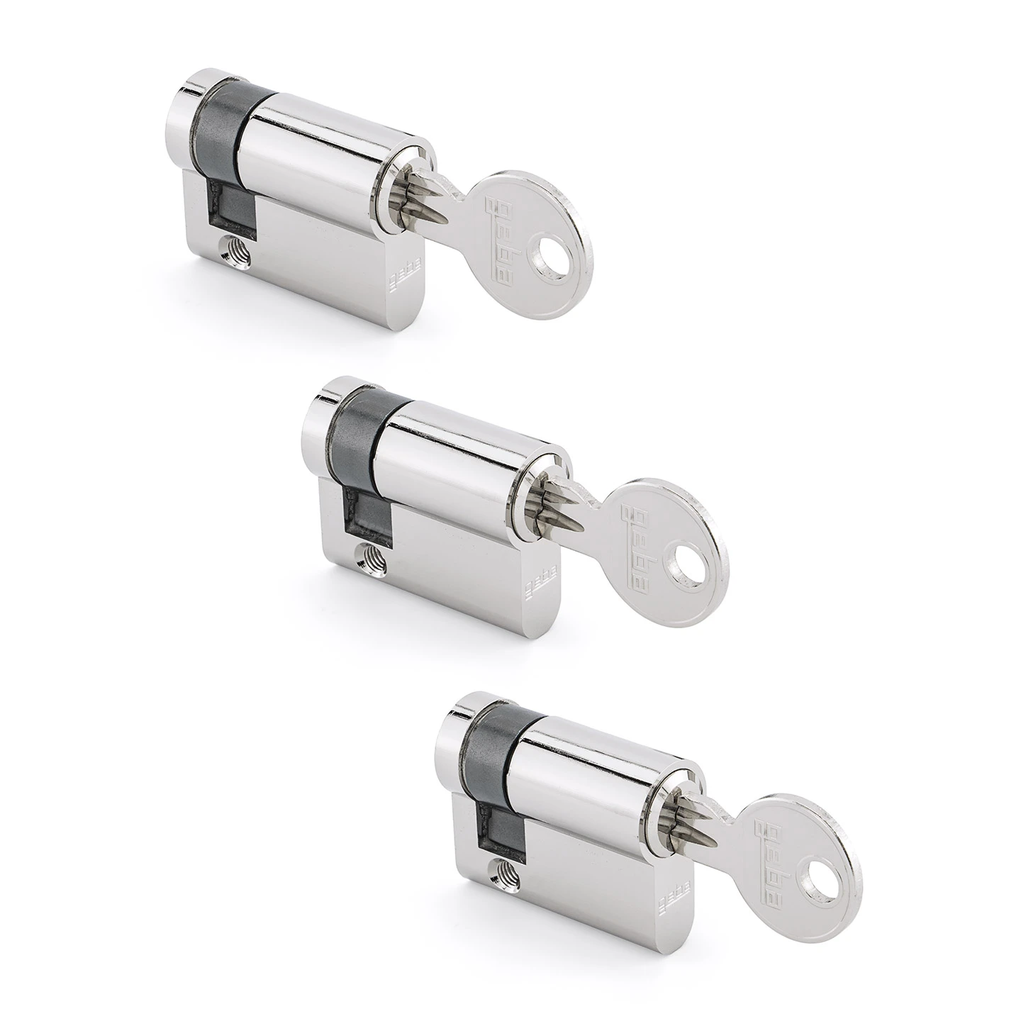 Die Hörmann Gleichschließenden Profilhalbzylinder im 3er-Set werden für Hörmann Schlüsseltaster verwendet und ermöglichen, dass bis zu 3 Taster mit nur einem Schlüssel bedient werden können. Jedem Zylinder liegen 3 Schlüssel bei. Auch für andere Anwendungen, bei denen gleichschließende Halbzylinder mit der Abmessung 30,5/10 mm zum Einsatz kommen sollen, kann dieses Set verwendet werden. Die Zylinder überzeugen zudem durch einen leichten Schließvorgang und Langlebigkeit auch bei hohem Nutzungsaufkommen.
