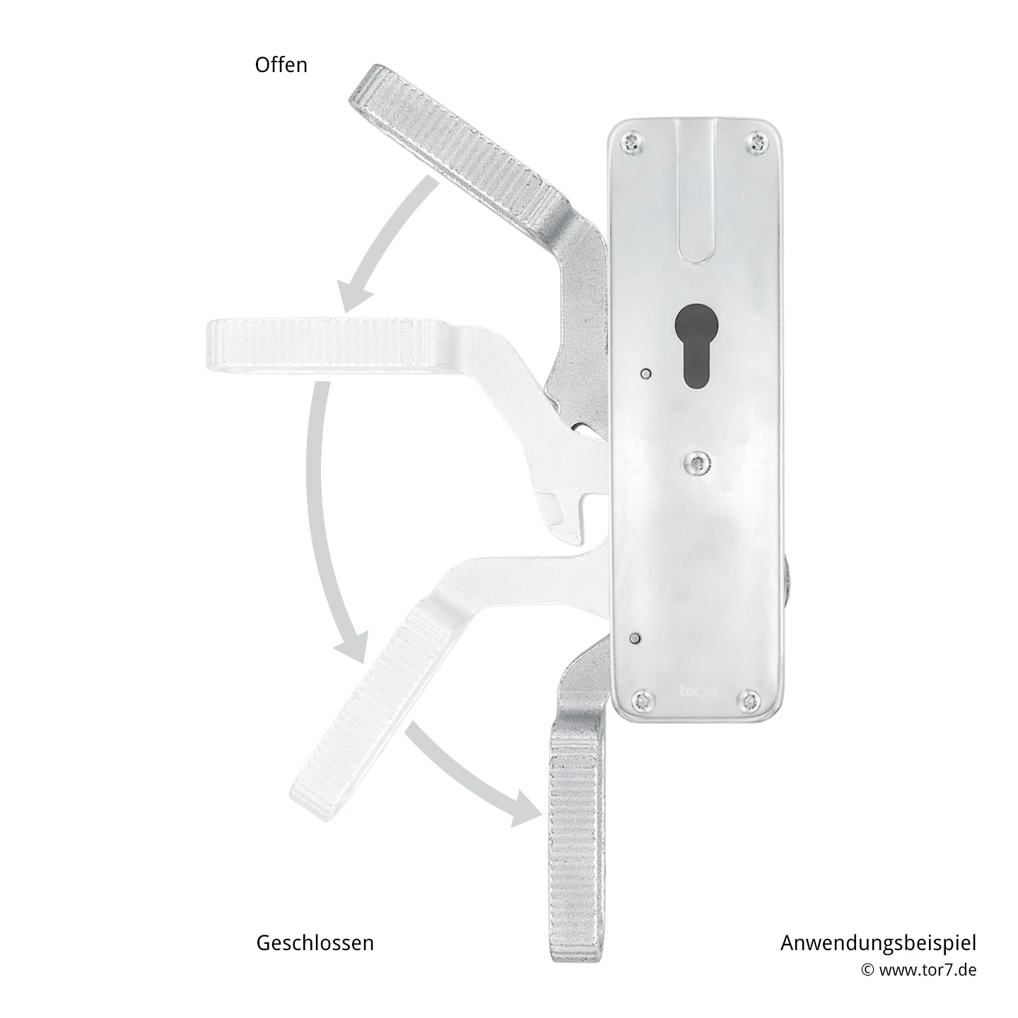 Hinweis: Der Hörmann Tortreibriegel Basküle links, PZ ist nur für links angeschlagene Falttorflügel geeignet. Sind die Flügel dagegen an der rechten Seite angeschlagen, so wird alternativ der Hörmann Tortreibriegel Basküle rechts, PZ empfohlen.