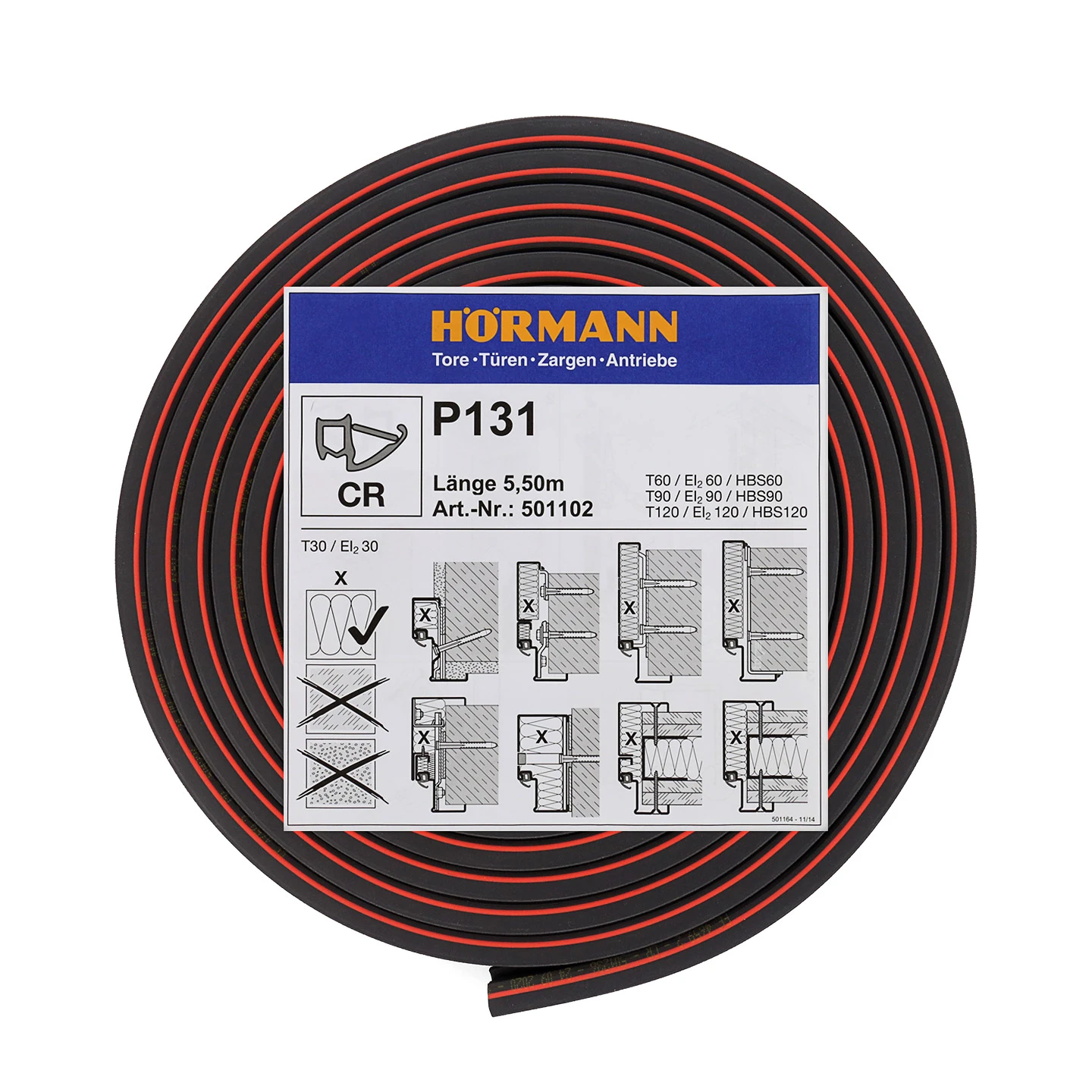 Die Hörmann Zargendichtung P131 mit Dichtungskeilen kann als Ersatzdichtung bei Stahlblechtüren der Ausführung Feuerschutztür Hörmann H16 OD, Hörmann H6 OD oder Hörmann H3 OD mit Zargenauskleidung aus Mineralwolle verwendet werden, die zusätzlich mit der Funktion Rauch- und Schallschutz ausgestattet sind. Mit dieser Dichtung werden die geforderten bautechnischen Leistungseigenschaften voll erfüllt und die Funktionen laut Zulassung gewährleistet. Bei Beschädigungen oder Verschleiß der bestehenden Dichtung sollte ein umgehender Austausch erfolgen. Dieser ist durch die vorgegebene Dichtungsnut der Systemzargen vollkommen problemlos und zeitsparend.