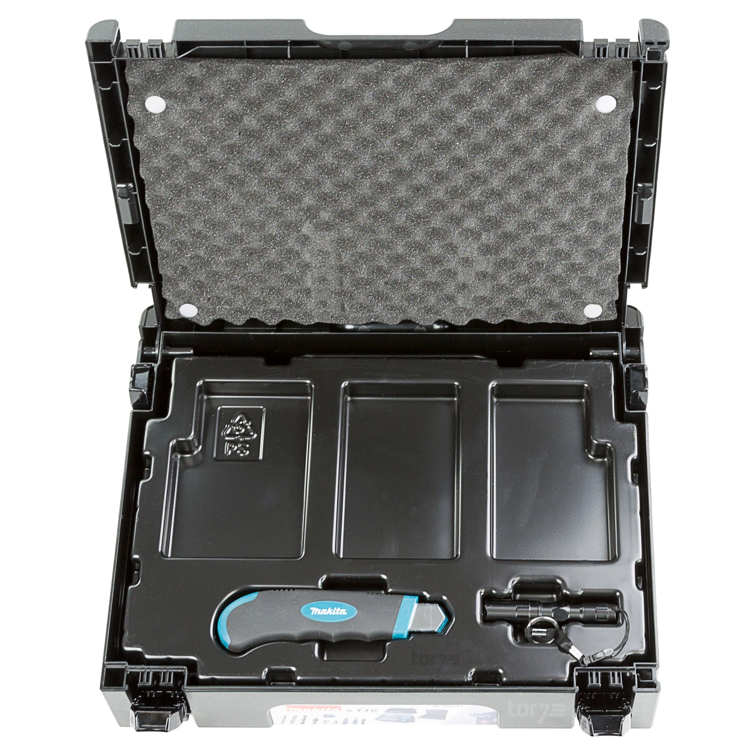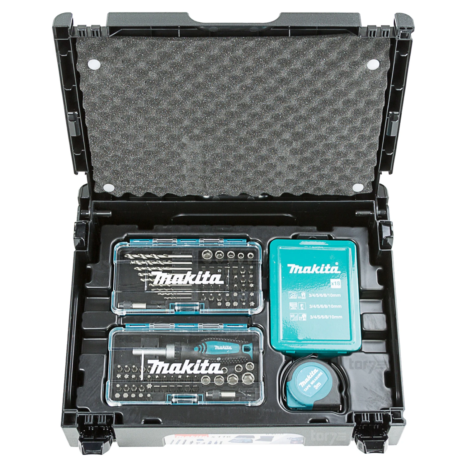 Das 116-teilige Makita-Set bietet eine umfangreiche Auswahl an Bohrern und Bits. Zusätzlich sind neben der Vielzahl an Kleinteilen eine LED-Lampe, ein Maßband und ein Cutter-Messer enthalten. Neben dem enthaltenden Zubehör für Makita Geräte bietet die obere Einlage durch Leerfächer genügend Platz für eine individuelle Bestückung.