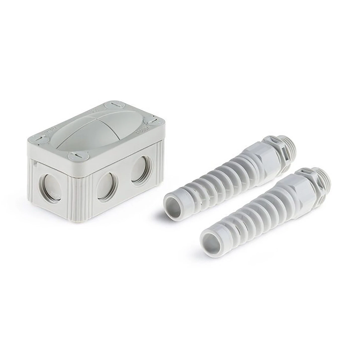 Da die Verbindung von der zweiten Motoreinheit zum Erdkabel ohne ein entsprechendes Schutzgehäuse der Feuchtigkeit draußen ausgeliefert wäre, wird die Verwendung dieses SOMMER Abzweigkasten mit Knickschutz gar zwingend empfohlen. Der Kasten besteht dabei aus einem Kunststoffunterteil und einem dazu passenden Deckel, die beide in der Farbe Lichtgrau (RAL 7035) gehalten sind. Innerhalb des Deckels ist ein Dichtgummi eingelassen, mit welchen sich der Spalt zum Unterteil hin abdichten lässt. Mit den zwei beiliegenden Kabelverschraubungen lassen sich zudem auch die Kabel geschützt vor Feuchtigkeit in das Gehäuse einführen. Weiterhin sind die Verschraubungen auch mit einem Knickschutz versehen. Wird unter Beachtung der Dichtigkeit der Abzweigkasten richtig eingebaut und verschraubt, entspricht er somit den Anforderungen der Schutzart IP 67.