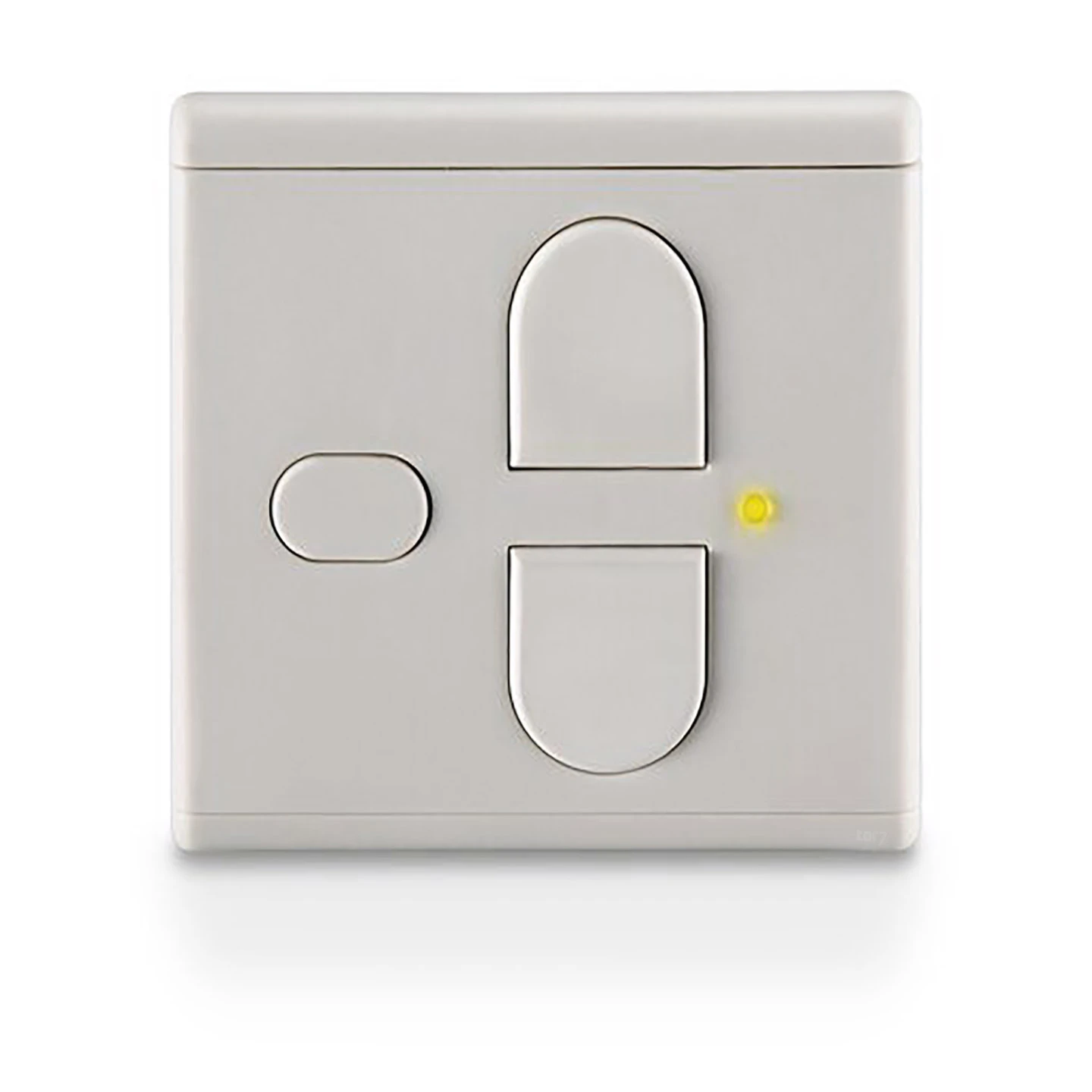 Das Design des neuen SOMMER AP Funkwandtaster SOMtouch, weiß wurde weitestgehend von dessen Vorgänger dem 3-Befehl-Funkwandtaster übernommen. So ist das Gehäuse mit seinen äußeren Abmessungen von 80 x 85 mm nahe an den Maßen klassischer Lichtschalter und Steckdosen gehalten. Die Oberseite des Tasters ist zur Mitte hin leicht gewölbt, wird aber niemals dicker als 14 mm. Des Weiteren befinden sich darauf zwei formschöne Tasten, die in deren Form schon die Richtungen Tor-Auf und Tor-Zu andeuten. Dazu gibt es seitlich der Mitte noch eine weitere kleine ovale Taste. Bei der hier erhältlichen Variante ist das gesamte Gehäuse inkl. der Tasten weiß gestaltet. Es ist aber unter der Artikelnummer S10447-00002 auch eine Variante mit schwarzem Gehäuse und weißen Tasten erhältlich.