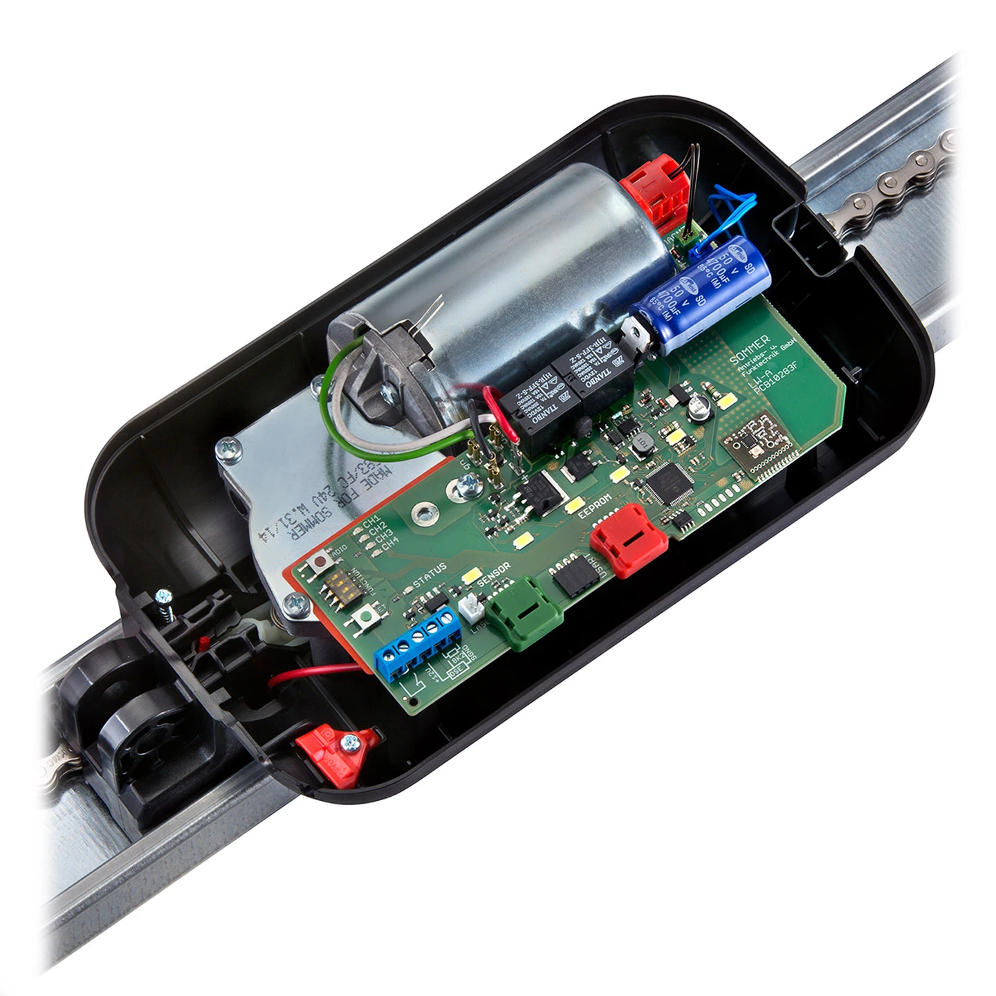 Garagentorantriebe der Baureihe SOMMER base+ zeichnen sich durch optische und technische Weiterentwicklungen aus. So wurde erstmals eine lichtstarke und sparsame Beleuchtung mit sechs SMD-LEDs in den mitfahrenden Laufwagen eingebaut. Der Stromabnehmer des Laufwagen wurde verbessert, sodass das Verschleißrisiko minimiert und die Betriebsdauer verlängert wird. Zudem sind die neuen Abnehmer noch zuverlässiger darin, die 24 V Niederspannung von Schiene und Kette aufzunehmen.